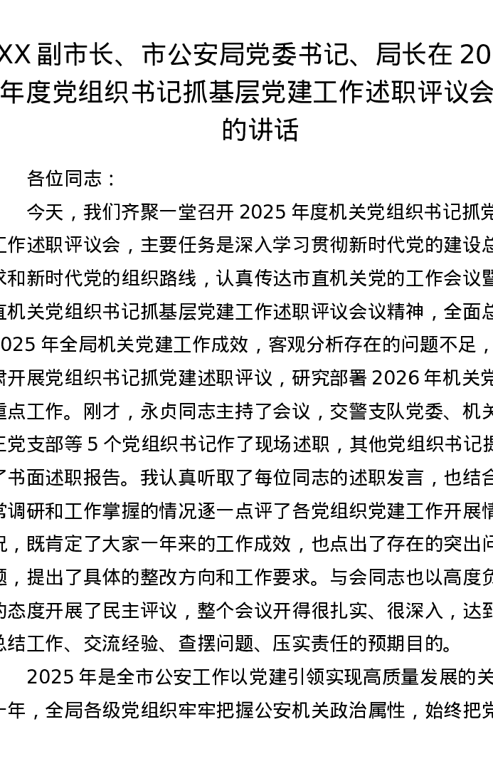 XX副市长、市公安局党委书记、局长在2025年度党组织书记抓基层党建工作述职评议会上的讲话
