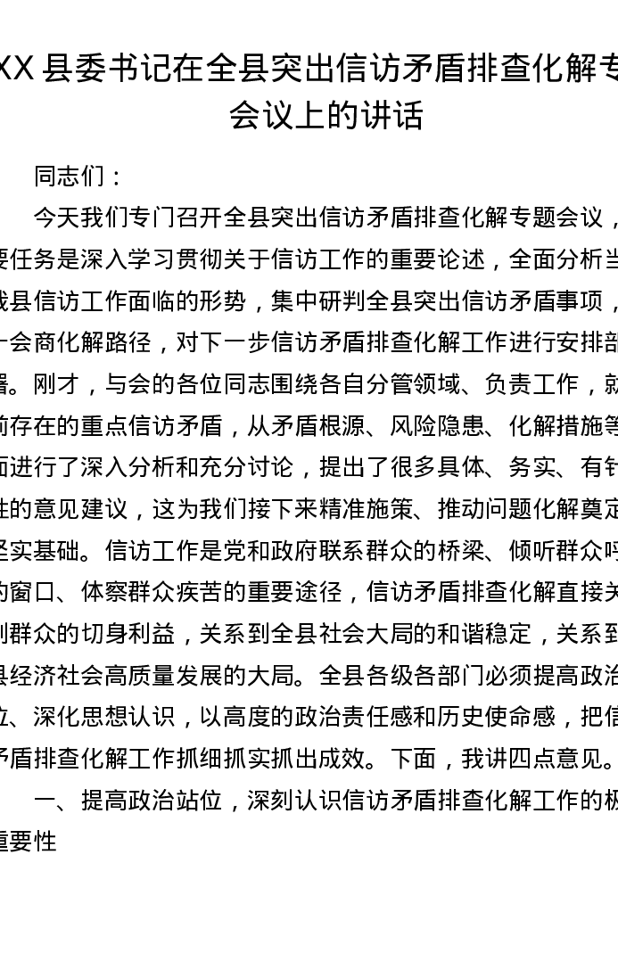XX县委书记在全县突出信访矛盾排查化解专题会议上的讲话