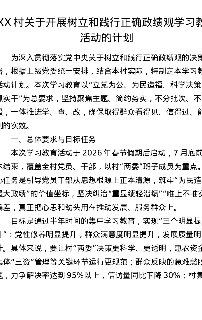 XX村关于开展树立和践行正确ZJG学习教育活动的计划