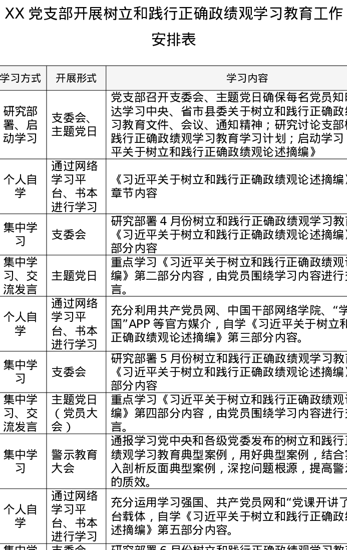 XX党支部开展树立和践行正确ZJG学习教育工作安排表