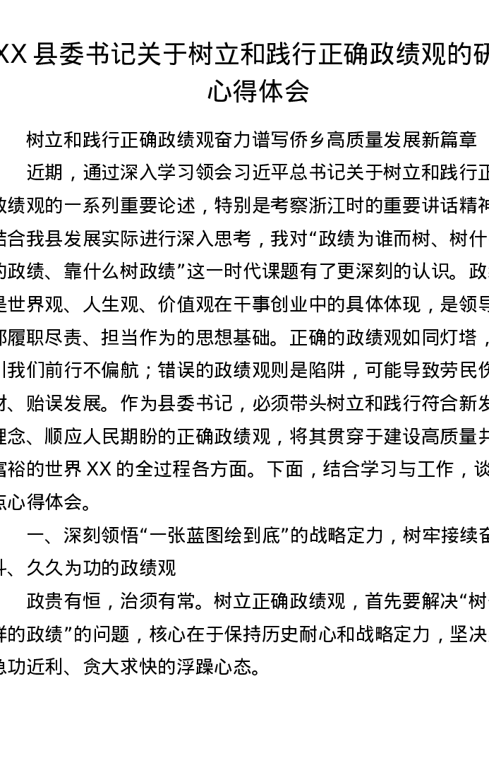 XX县委书记关于树立和践行正确ZJG的研讨心得体会2