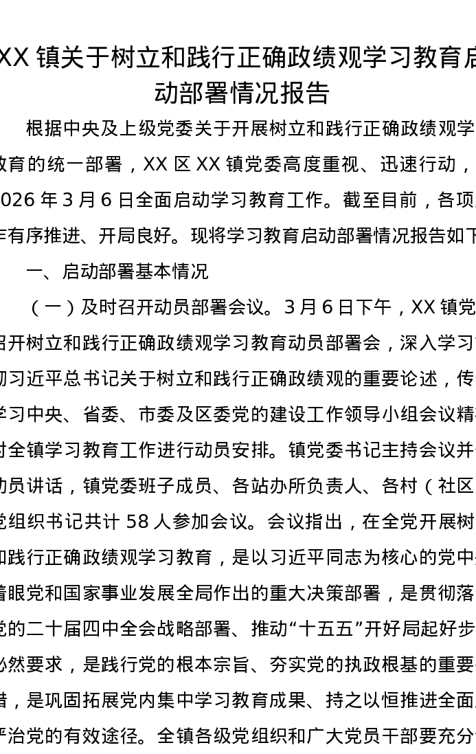 XX镇关于树立和践行正确ZJG学习教育启动部署情况报告