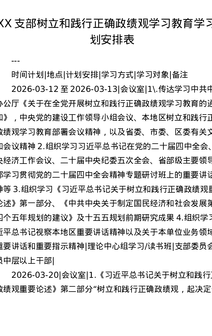 XX支部树立和践行正确ZJG学习教育学习计划安排表格