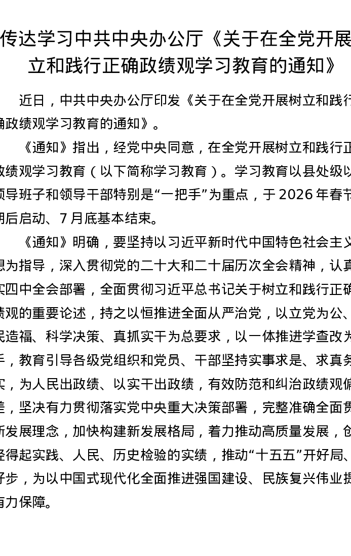 传达学习及贯彻落实中共中央办公厅《关于在全党开展树立和践行正确ZJG学习教育的通知》