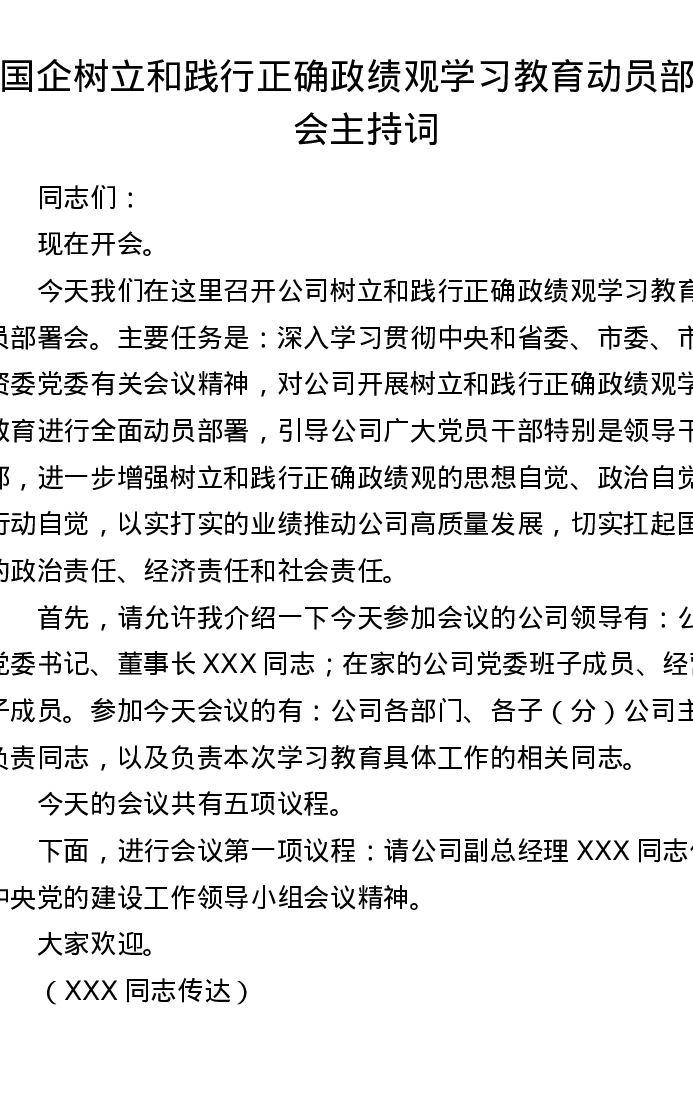 国企树立和践行正确ZJG学习教育动员部署会主持词