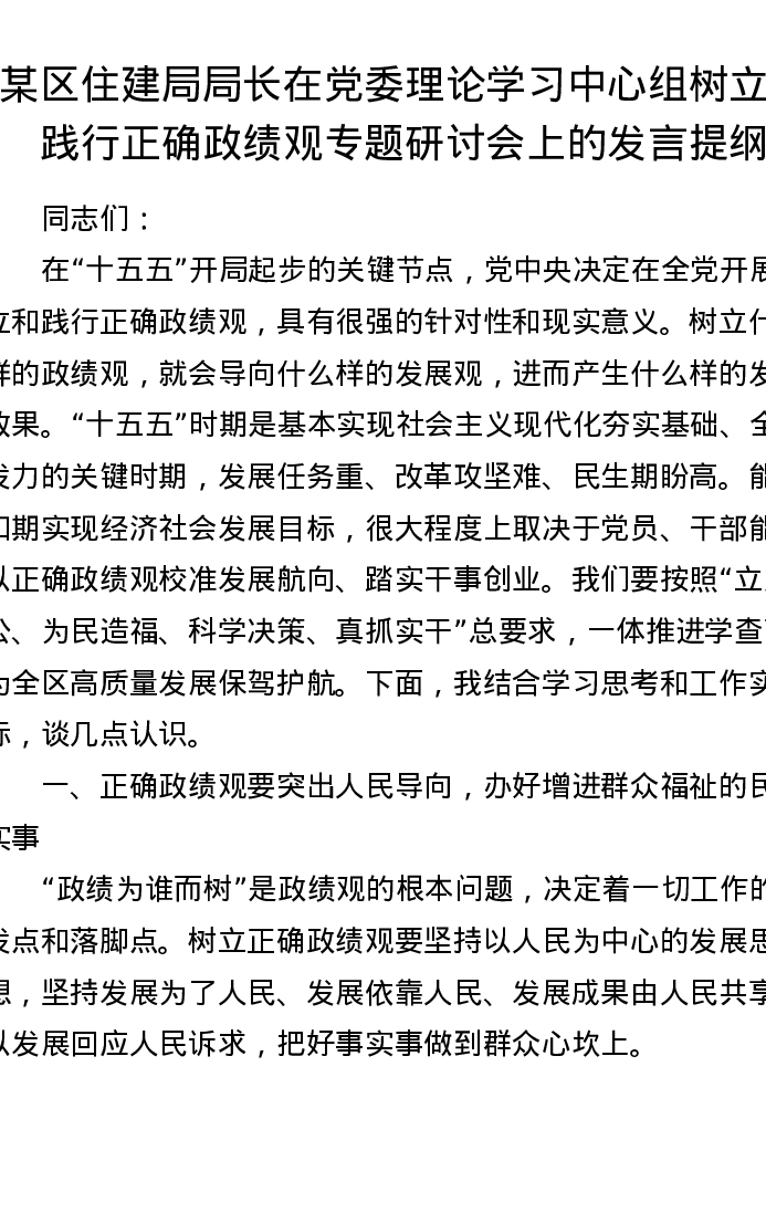 某区住建局局长在党委理论学习中心组树立和践行正确ZJG专题研讨会上的发言提纲