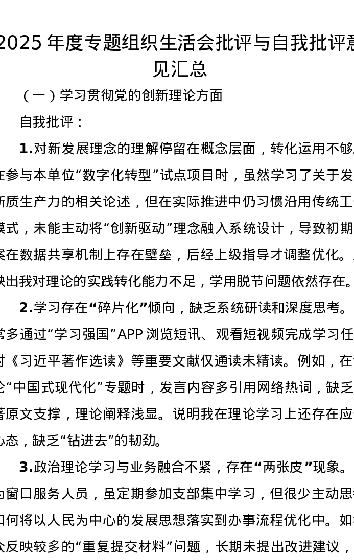 2025年度专题组织xxx批评与自我批评意见汇总