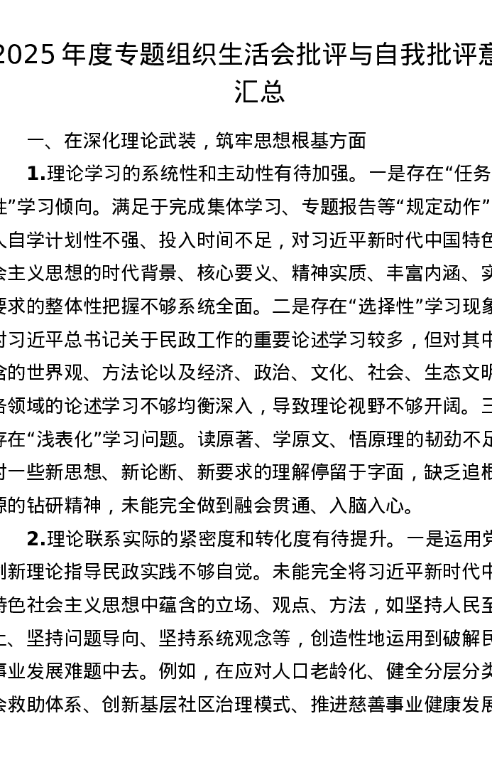 2025年度专题组织xxx批评与自我批评意见汇总2