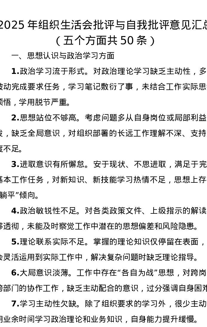 2025年组织xxx批评与自我批评意见汇总(五个方面共50条)