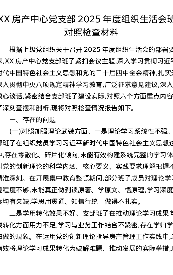 XX房产中心党支部2025年度组织xxx班子对照检查材料