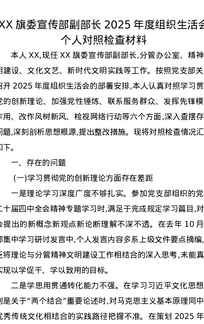 XX旗委宣传部副部长2025年度组织xxx个人对照检查材料