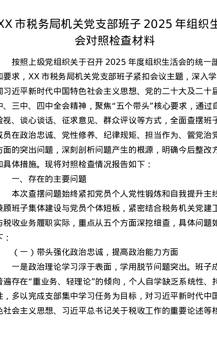XX市税务局机关党支部班子2025年组织xxx对照检查材料2