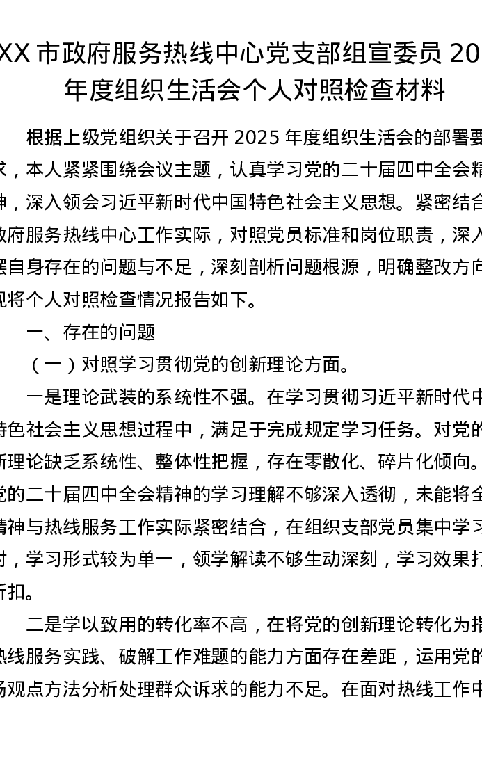 XX市政府服务热线中心党支部组宣委员2025年度组织xxx个人对照检查材料