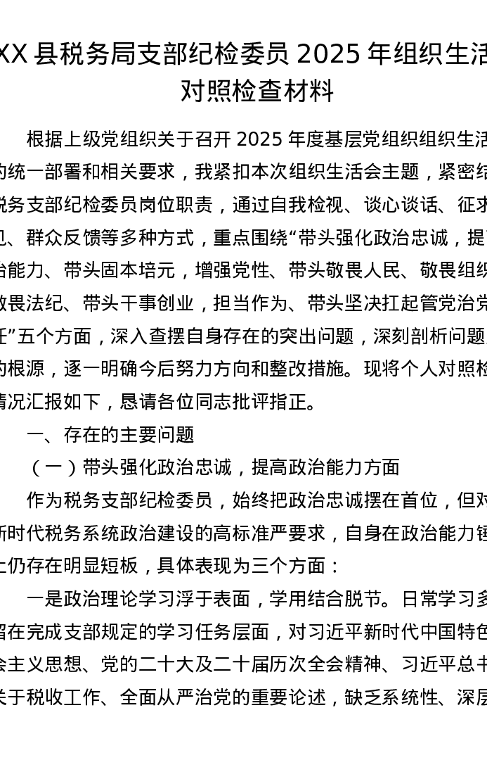 XX县税务局支部纪检委员2025年组织xxx对照检查材料