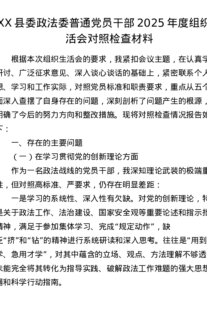 XX县委政法委普通党员干部2025年度组织xxx对照检查材料2
