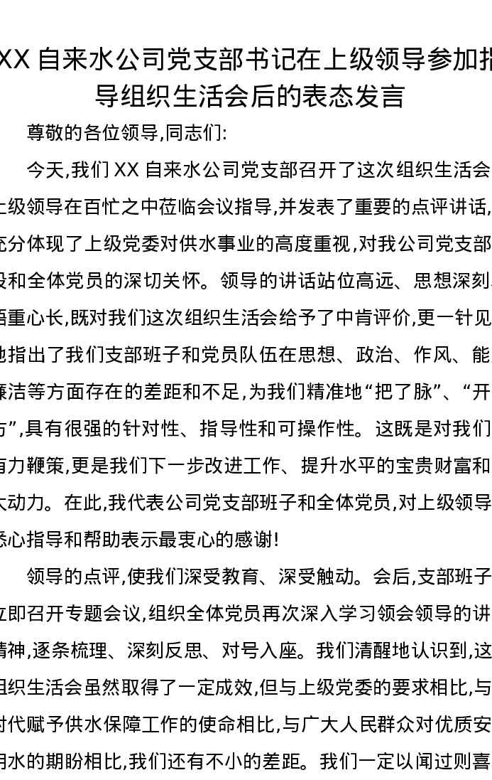 XX自来水公司党支部书记在上级领导参加指导组织xxx后的表态发言