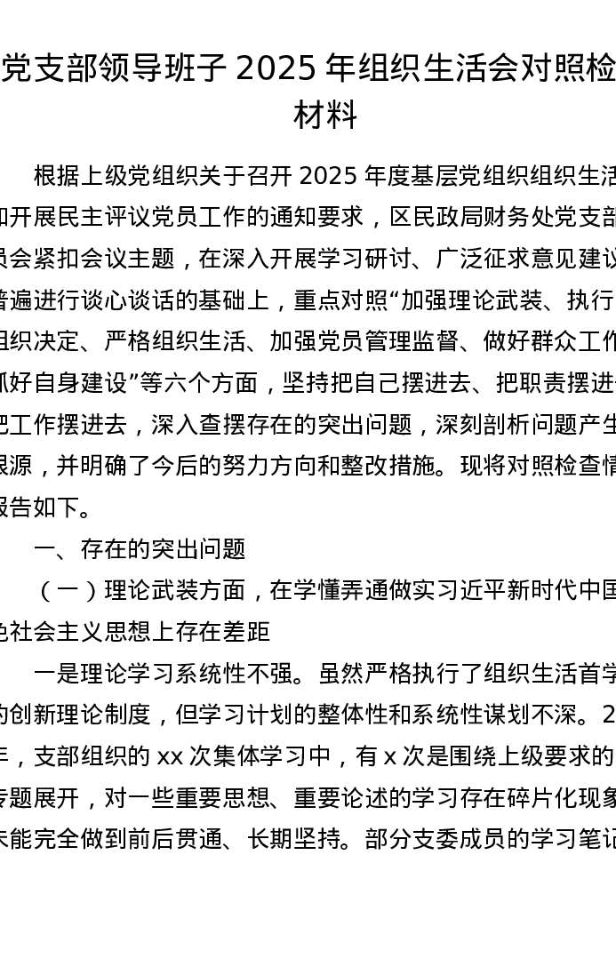 党支部领导班子2025年组织xxx对照检查材料