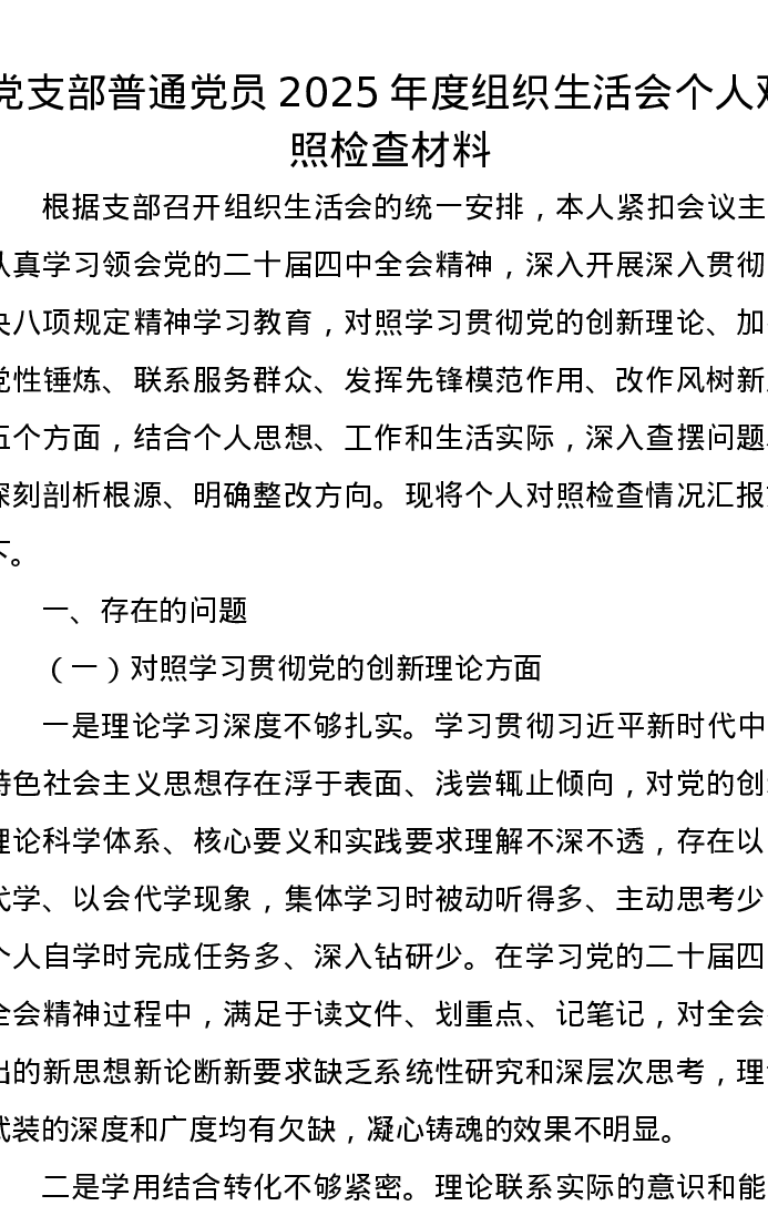 党支部普通党员2025年度组织xxx个人对照检查材料