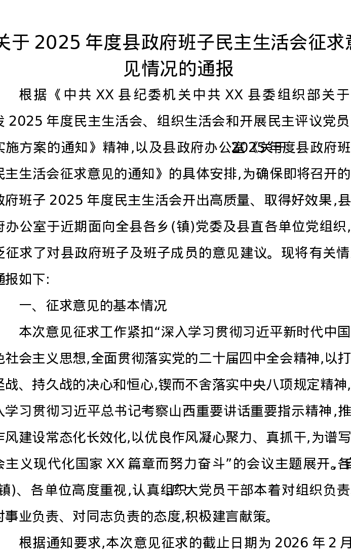 关于2025年度县政府班子xxxxx征求意见情况的通报