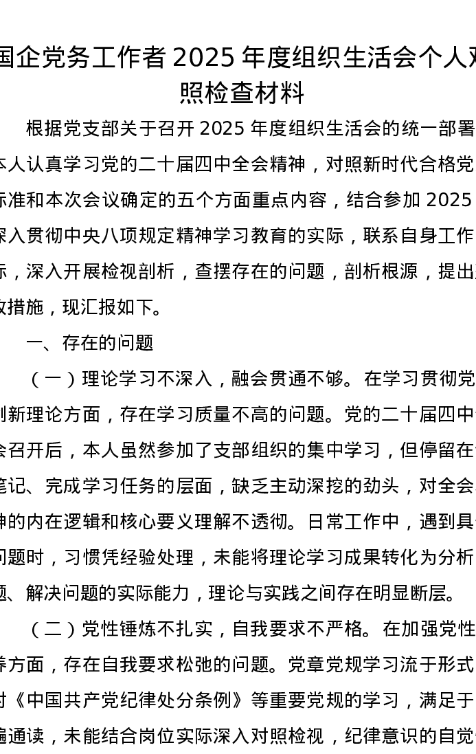 国企党务工作者2025年度组织xxx个人对照检查材料