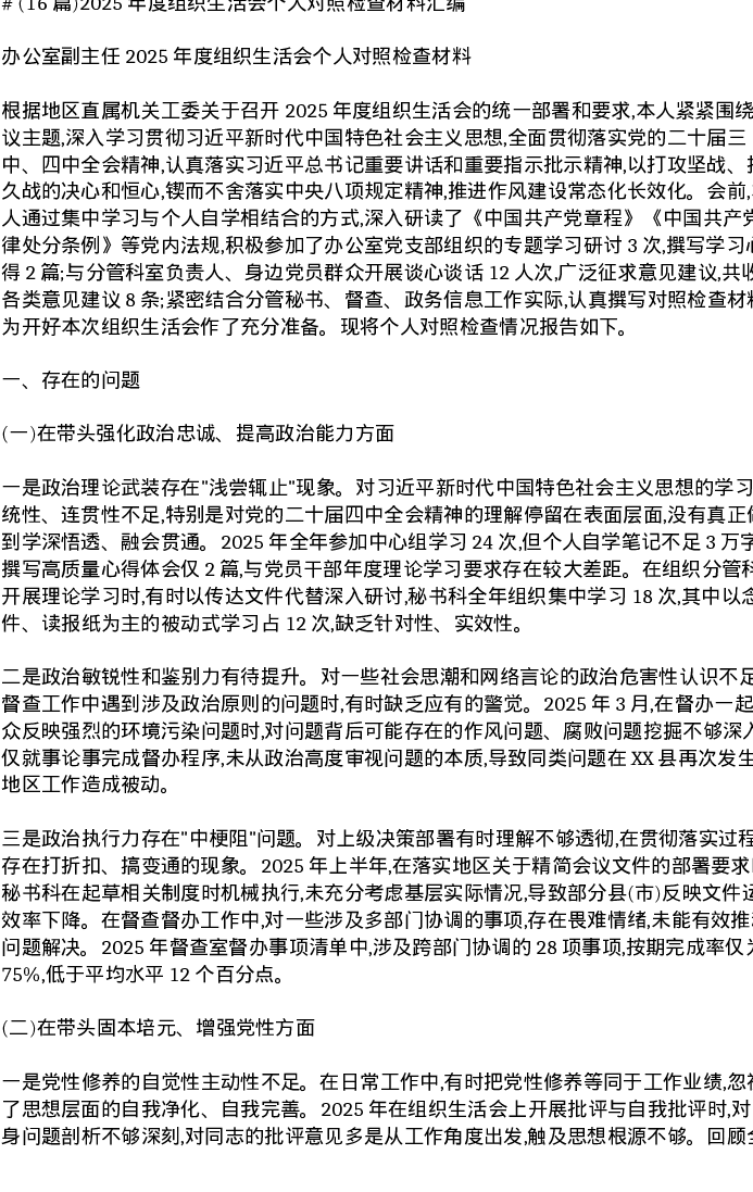 汇编:2025年度组织xxx个人对照检查材料16篇
