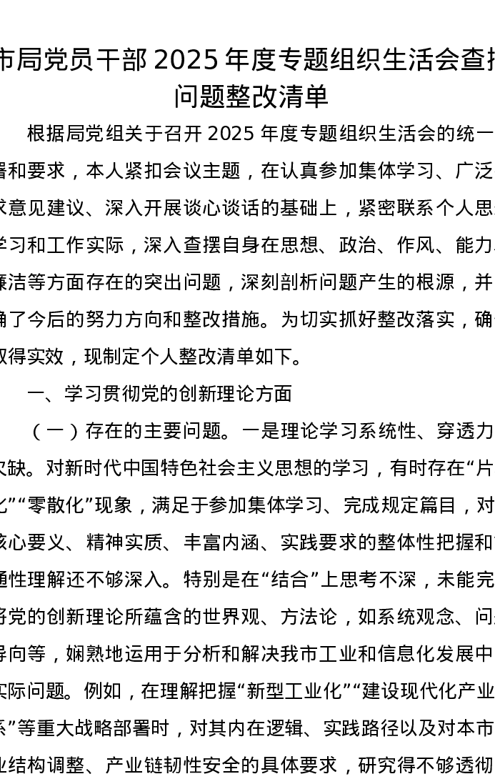 市局党员干部2025年度专题组织xxx查摆问题整改清单