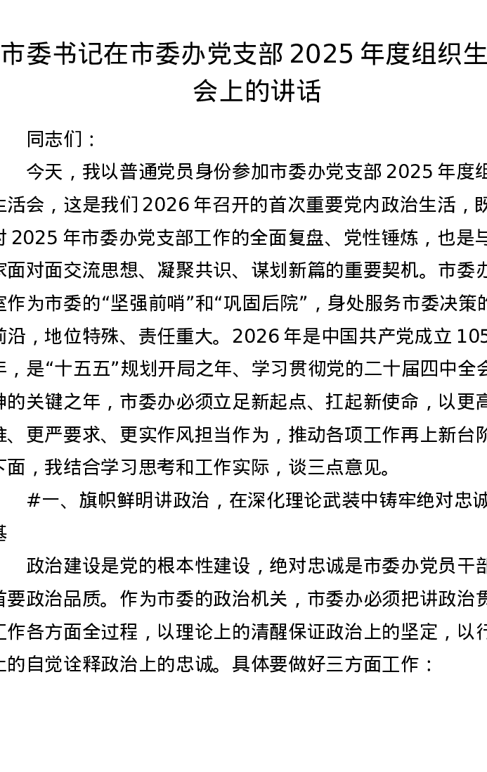 市委书记在市委办党支部2025年度组织xxx上的讲话