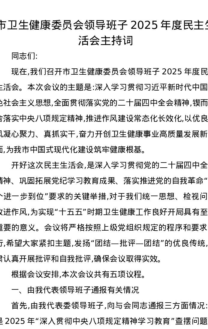 市卫生健康委员会领导班子2025年度xxxxx主持词