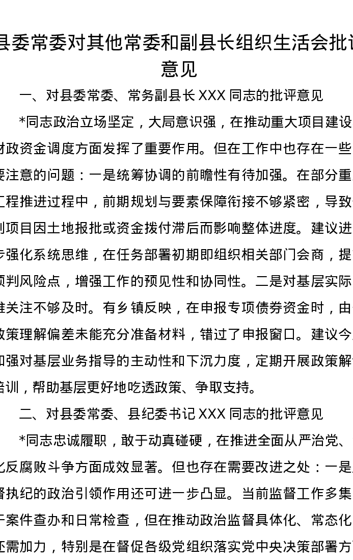 县委常委对其他常委和副县长组织xxx批评意见