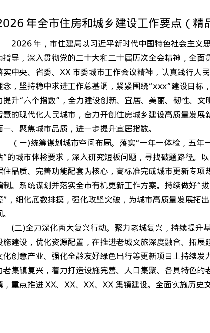 2026年全市住房和城乡建设工作要点
