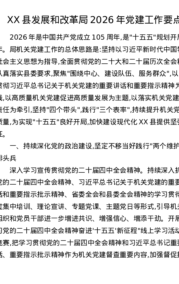 XX县发展和改革局2026年党建工作要点