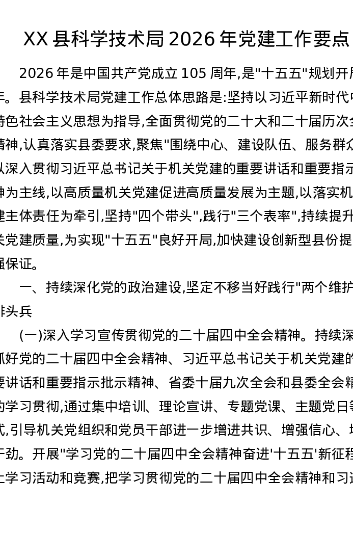XX县科学技术局2026年党建工作要点