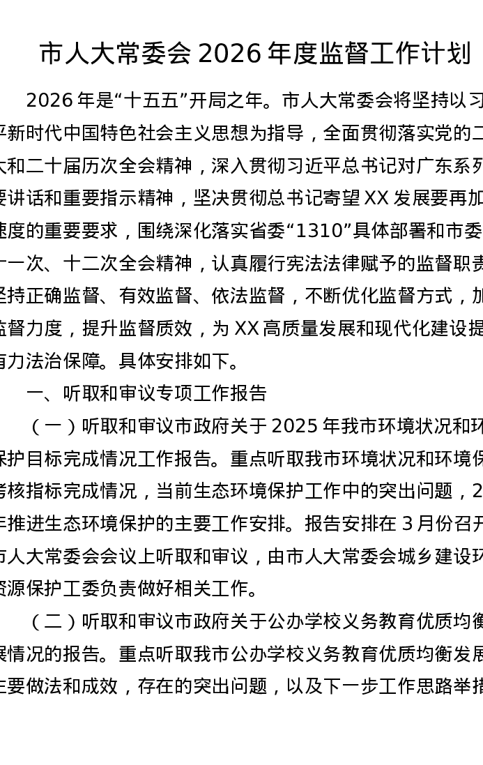市人大常委会2026年度监督工作计划