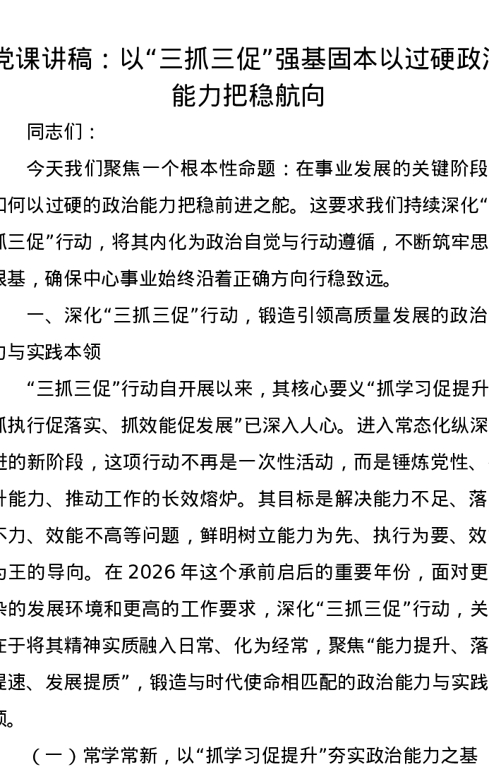 党课讲稿:以三抓三促强基固本 以过硬政治能力把稳航向