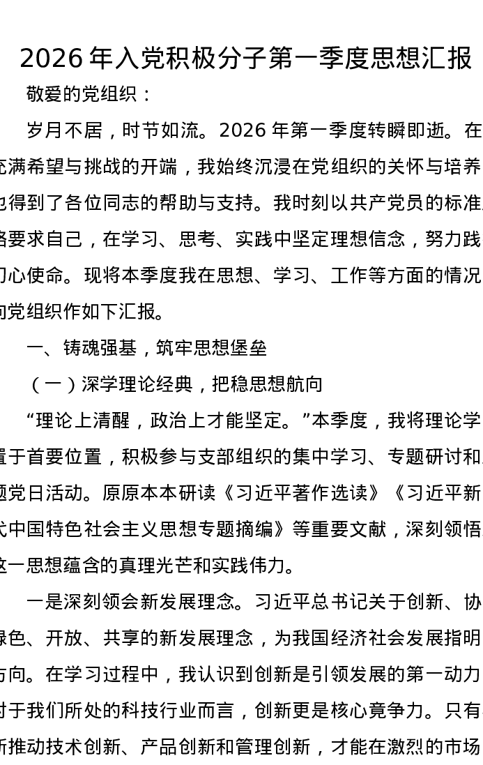 2026年入党积极分子第一季度思想汇报