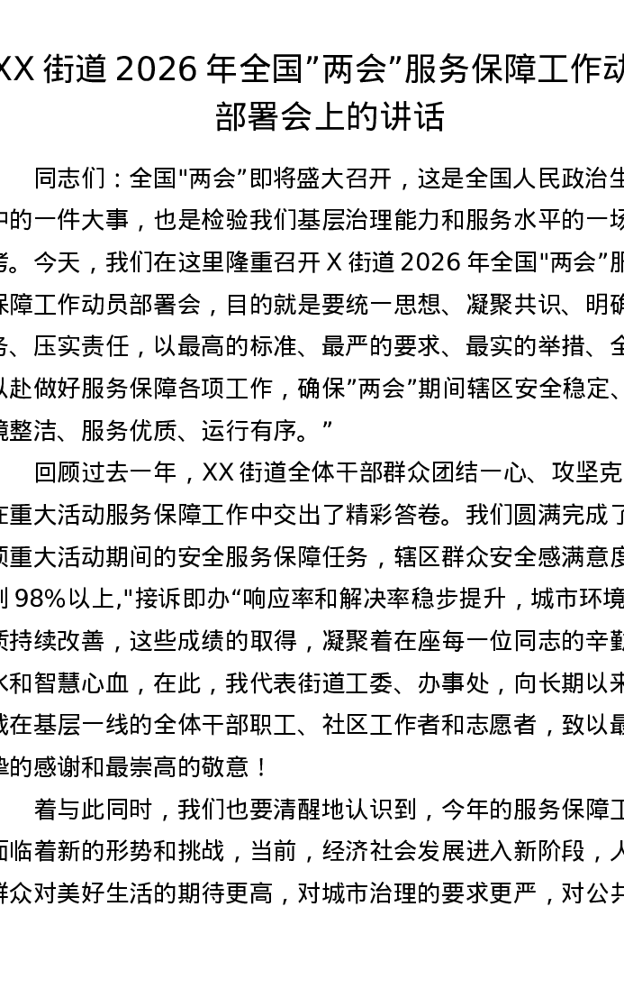 XX 街道2026年全国两会服务保障工作动员部署会上的讲话