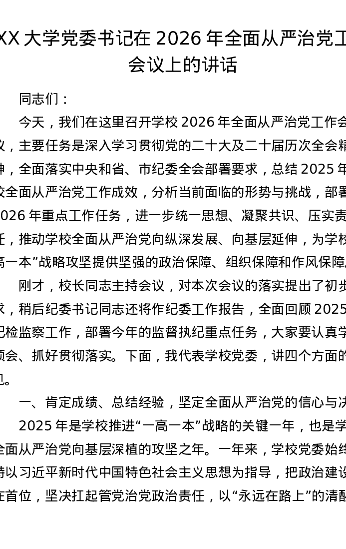 XX大学党委书记在2026年全面从严治党工作会议上的讲话