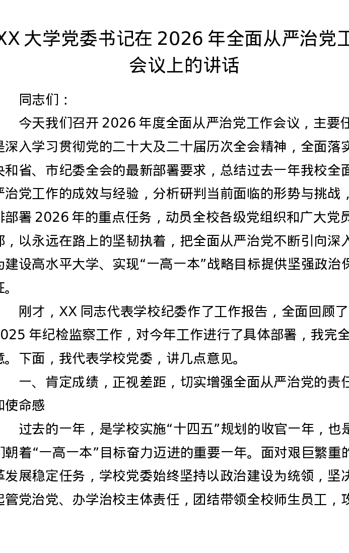 XX大学党委书记在2026年全面从严治党工作会议上的讲话2