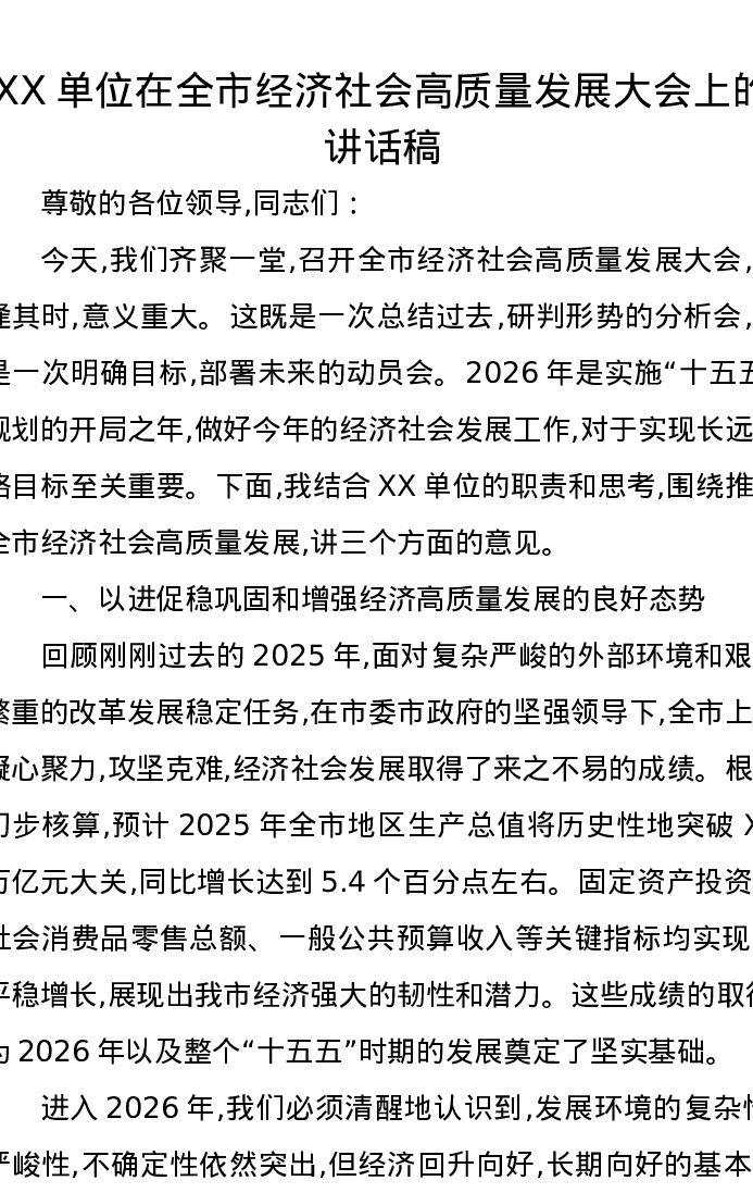 XX单位在全市经济社会高质量发展大会上的讲话稿