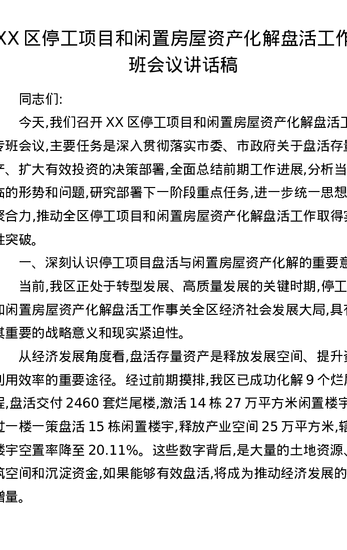 XX区停工项目和闲置房屋资产化解盘活工作专班会议讲话稿