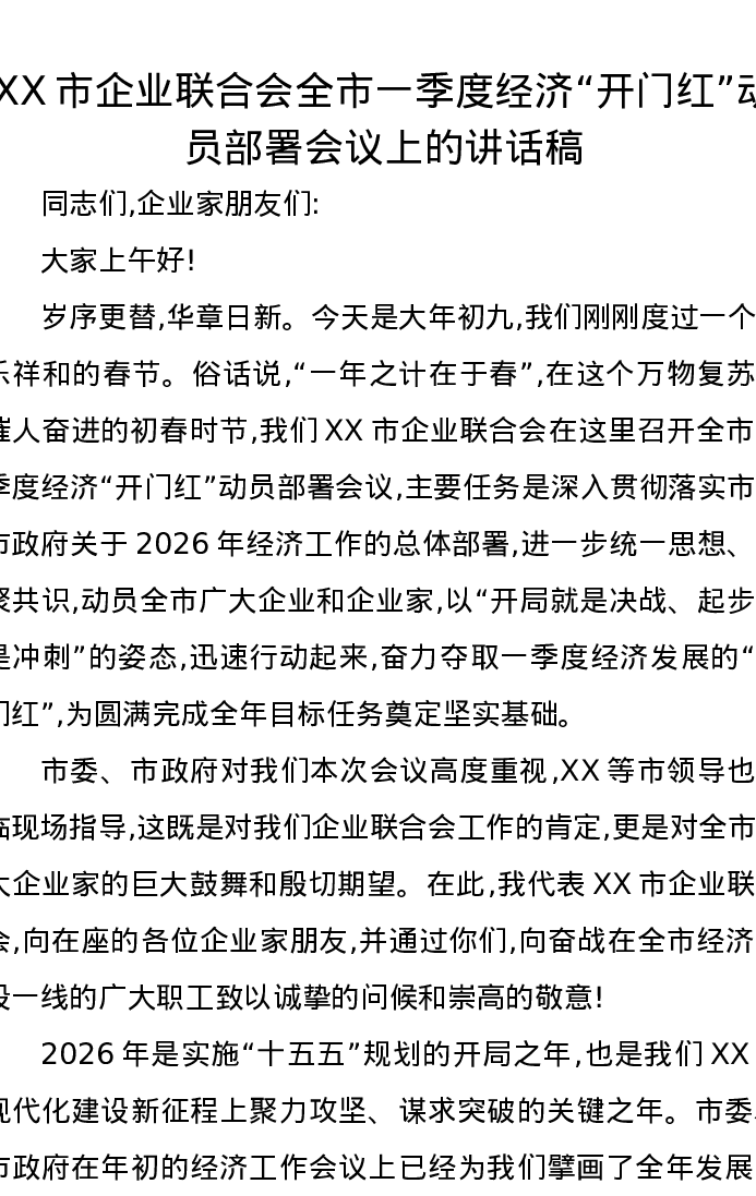 XX市企业联合会全市一季度经济开门红动员部署会议上的讲话稿