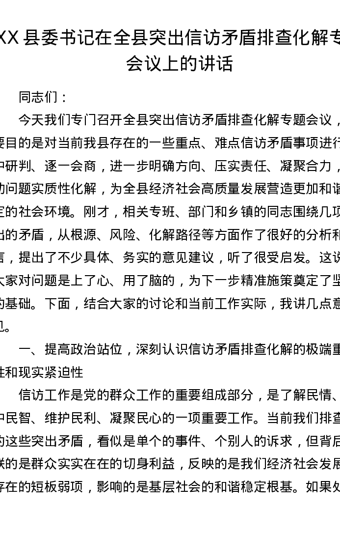 XX县委书记在全县突出信访矛盾排查化解专题会议上的讲话2