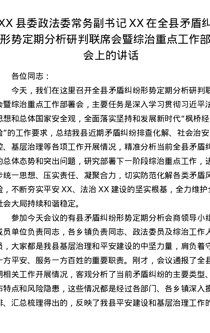 XX县委政法委常务副书记XX在全县矛盾纠纷形势定期分析研判联席会暨综治重点工作部署会上的讲话