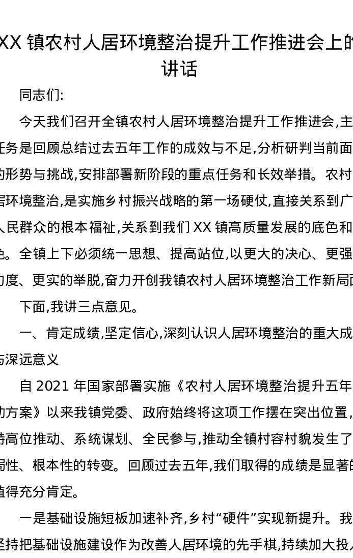XX镇农村人居环境整治提升工作推进会上的讲话