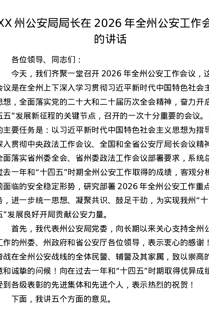 XX州公安局局长在2026年全州公安工作会上的讲话