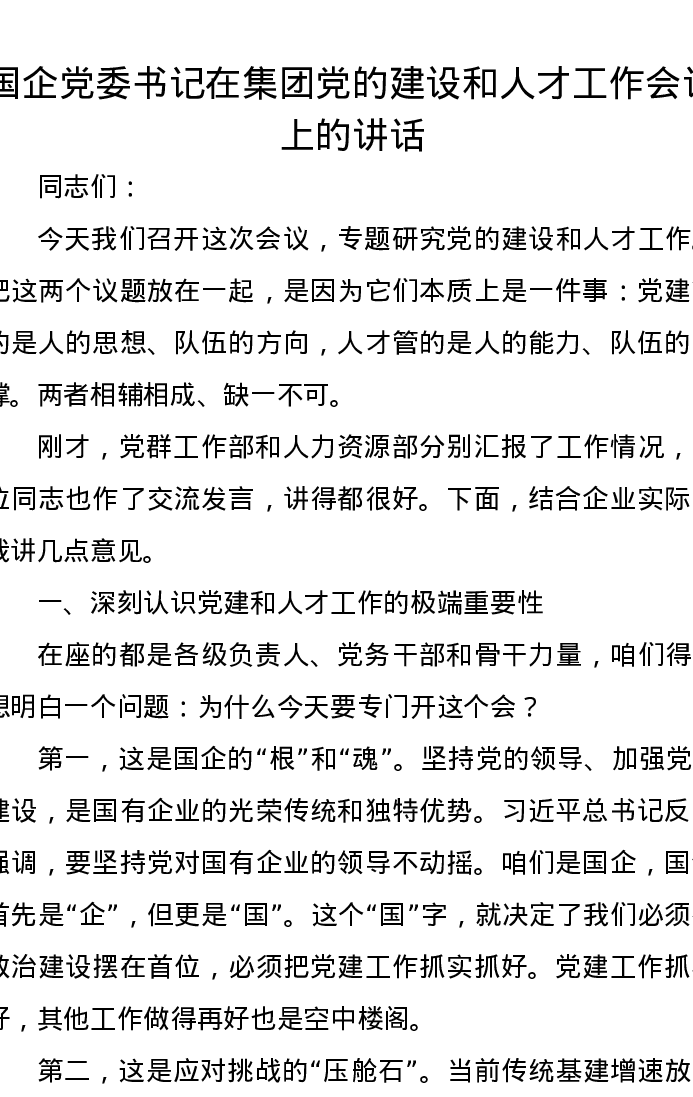 国企党委书记在集团党的建设和人才工作会议上的讲话