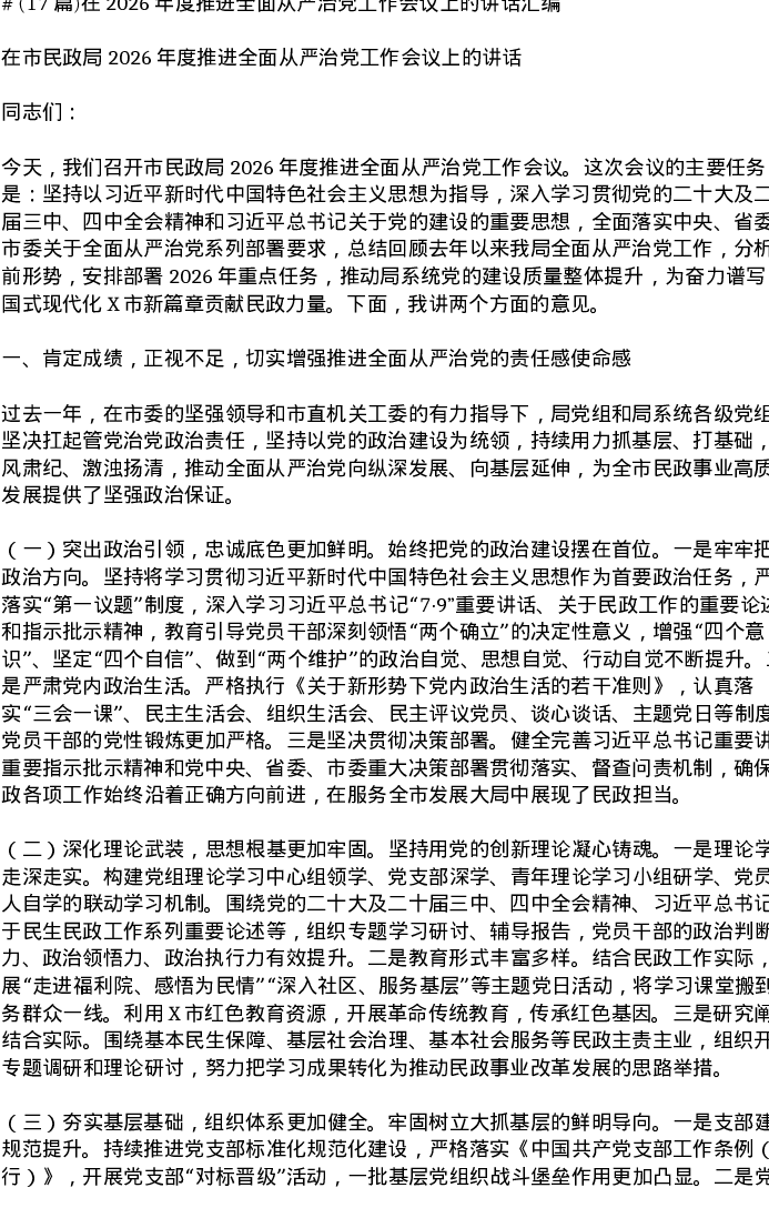 汇编:在2026年度推进全面从严治党工作会议上的讲话17篇