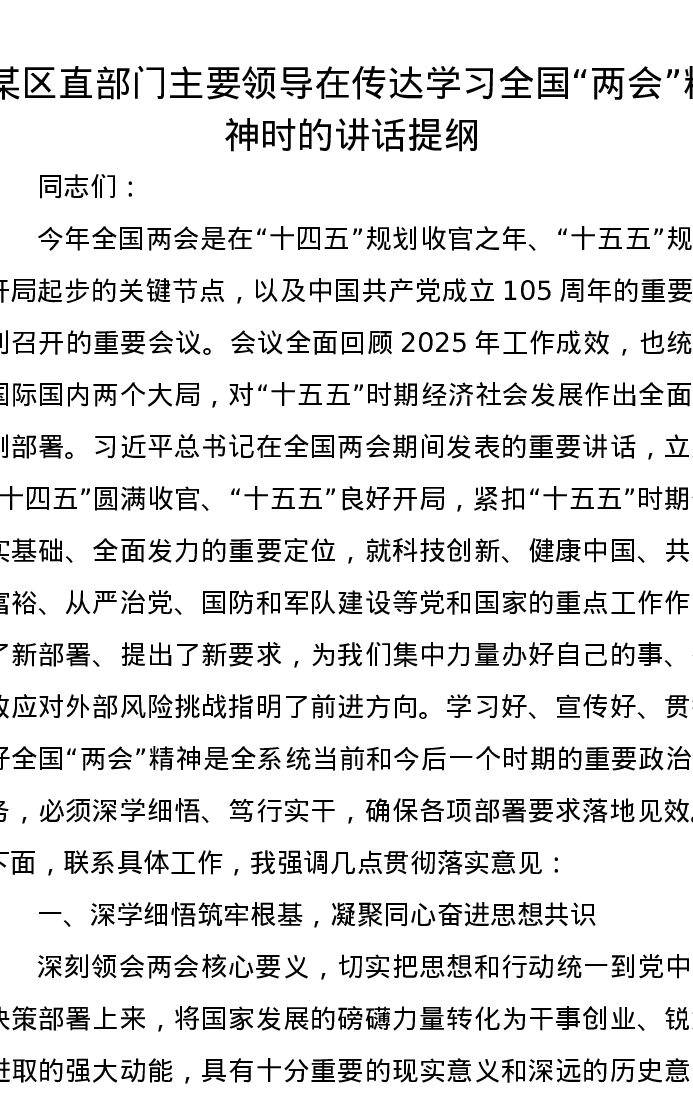 某区直部门主要领导在传达学习全国两会精神时的讲话提纲