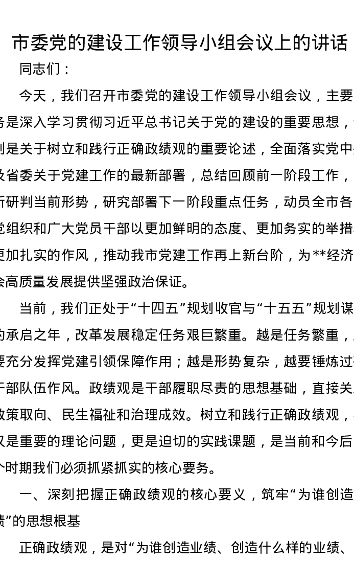市委党的建设工作领导小组会议上的讲话