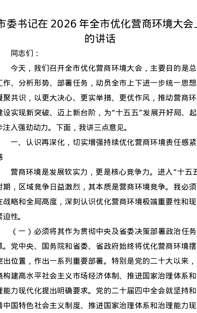 市委书记在2026年全市优化营商环境大会上的讲话